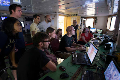 Today has been an amazing day, because we have successfully recovered three gravity cores of approximately 3 m length at 300, 500 and 600 m water depth.The selection of the coring locations was based on the recently acquired multibeam data from the Malta-Sicily Escarpment. We targeted an interesting small landslide within a larger landslide scar to understand its nature and age. While we were collecting the cores we were paid a visit by a friendly shark.